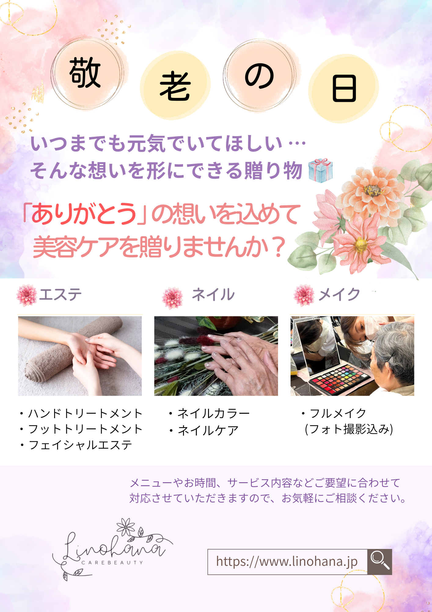 ご訪問プランやイベント型プラン等各種おすすめプランを用意しております。 ご訪問プラン 1回 60分 8,800円(税込) GIFTプラン 大切なご家族様のお誕生日や敬老の日・母の日・父の日・長寿のお祝いなど日頃の感謝を伝える贈り物。ご利用者様に最高の時間をお過ごしいただくために最高のサービスをご提供いたします。介護美容施術後、素敵な笑顔を記念撮影し後日プレゼントいたします。 トライアル(1回のみ) 初回限定の割引料金 体験価格 60分 4,400円(税込) ご利用者様から嬉しい感想が届きました。 丁寧に時間をかけて好きな色やネイルシールを選ばせてもらう時間も楽しかったです。 何年もメイクをしていなかったので最初は少し恥ずかしかったですが、気になっていたシミが消えたのはうれしかったです。